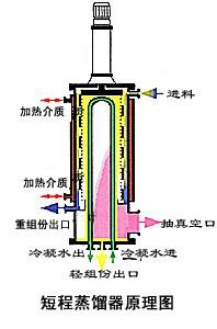 短程蒸馏器是一个工作在1~0.001mbar压力下热分离技术过程,它较低的沸腾温度,适合热敏性、高沸点物。其基本构成:带有加热夹套的圆柱型筒体,转子和内置冷凝器;在转子的固定架上精确装有刮膜器和防飞溅装置。内置冷凝器位于蒸发器的中心,转子在圆柱型筒体和冷凝器之间旋转。
